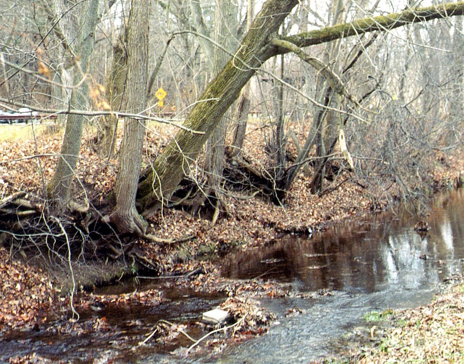 The stream bank is being eroded away during storm events. Tree roots are exposed and eventually the trees fall over and die. The soil that is carried away eventually settles out as silt along the stream bottom and can suffocate sensitive bottom dwelling (benthic) organisms (macroinvertebrates) that provide food for fishes. This siltation and sedimentation can decrease the variety of organisms living in Catfish Run. Increased erosion also compromises bridges and other infrastructure along the stream.