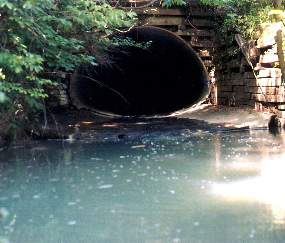 Here we see Catfish Run exiting the culvert. The odd, milky water is common where an AMD flow enters a non-polluted flow. The pH of AMD can be very low(3.0-4.0). Heavy metals, such as iron and aluminum, remain in solution at these pH levels. When the AMD combines with the clean flow the pH increases and the heavy metals precipitate out of solution. This precipitate gives the water a milky appearance.